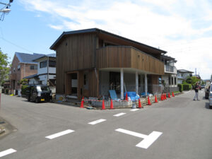 道路に出るための格子の引き戸によりデザインを統一しています。