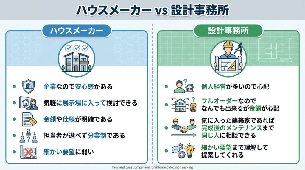 ハウスメーカーは「企業なので安心感がある」「気軽に展示場に入って検討できる」「金額や仕様が明確である」「担当者が選べず分業制である」「細かい要望に弱い」